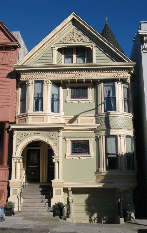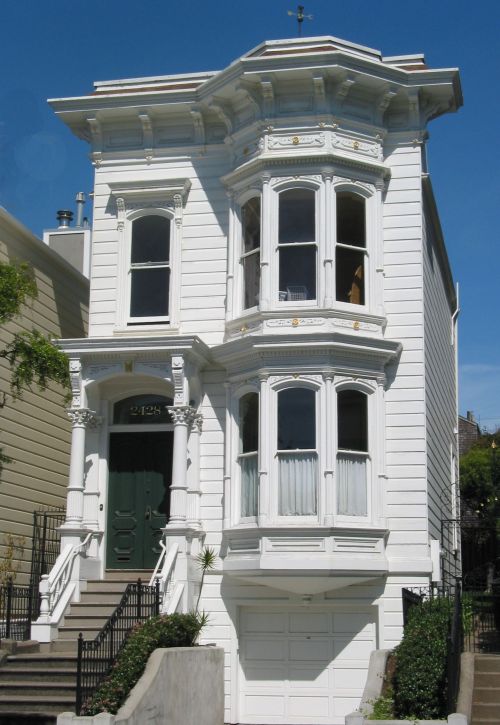 The Italianate style was the first national style to have a major effect on San Francisco's built environment. The Italianate craze first swept the United States during the 1840s and 1850s, initially as romantic country villas popularized by influential tastemakers such as A. J. Downing. Gradually the style filtered down to the middle classes and by the 1860s Italianate rowhouses were being constructed throughout most American communities, including the booming young city of San Francisco. The Italianate style underwent some important changes after arriving in California. Unlike eastern and Midwestern cities, where the style was typically expressed in stone or brick, in California, due to lack of adequate supplies of cut stone or lime, the style manifested itself in wood. The applied architectural elements, including the quoins at the corners of the house and the over-sized brackets at the eaves, are decorative versions of the masonry reinforcements. Signature elements of the Italianate style in San Francisco include bold brackets and entablatures, false parapet roofs which conceal the gable roof, narrow vertically proportioned windows and doors with projecting bracketed hoods.