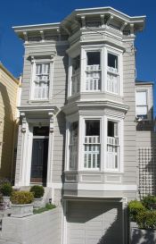 The bay-windowed Italianate began to supplant the flat-fronted Italianate in the late 1870s and early 1880s as increased land costs shrunk lot sizes to the typical 25' x 100' or 25' x 80' dimensions. Unlike the more generously sited flat-fronted Italianates, the facades of the bay-windowed variation are typically only two-bays in width. The bay window arose in order to increase the square footage of each floor and to increase the amount of available light. The addition of a bay window also allowed the builder/architect to add more millwork and other decoration to the otherwise rather severe façade. The bay-windowed Italianate was embraced by San Francisco builders, particularly large-scale developers such as The Real Estate Associates, who constructed dense rows of nearly identical bay-windowed Italianates throughout the Mission, the Western Addition, Pacific Heights and elsewhere. The impact of this variation was so widespread that contemporary observers called San Francisco the "City of Bay Windows." By the 1880s these simpler stone-based embellishments of the flat-fronted Italianates were augmented by the addition of inexpensive and mass-produced redwood millwork. The bay-windowed Italianates often featured ornate columned porticos surmounted by turned balustrades. The flat-headed windows of the 1870s were replaced by segmentally-arched windows surmounted by projecting window hoods. The brackets grew larger and were embellished with flutes and incised ornament. The bulk of the ornament was reserved for the bay window which was embellished with incised spandrel panels, pipe colonnettes and dentil course moldings.