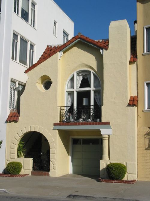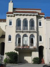 Popular in San Francisco in the first decades of the 20th century until World War II, Mediterranean Revival is an umbrella term that reflects diverse European traditions and was used in the design of both grand homes that sought to convey an imposing presence, and modest, but still impressive, rowhouses. Mediterranean style structures tend to suggest a relatively massive quality with symmetrical primary facades, a rectangular floor plan, and Classical, Spanish or Beaux Arts details and gardens. An eclectic style, the Mediterranean Revival is based loosely on 16th century Italian palazzo architecture, fused with elements of Spanish and Moorish architectural idioms with a touch of French influence. The popularity of the style was due in large part to the promotion by real estate developers and regional boosters who sought to convey a California cachet associated with Mediterranean resorts. The style was well-suited to the California climate. Exterior colors were mostly sunshine hues and warm earth tones: whites or ochres, pale pinks, yellows and grays that reflected the California light.